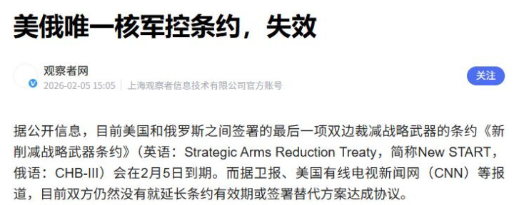 观察者网 美俄唯一核军控条约,失效