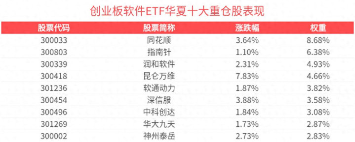 创业板软件ETF华夏紧密跟踪创业板软件指数,截至2026年1月30日,创业板软件指数(399264)前十大权重股分别为同花顺、润泽科技、昆仑万维、指南针、深信服、润和软件、网宿科技、软通动力、中科创达、汉得信息,前十大权重股合计占比48.61%。(以上所列股票仅为指数成份股,无特定推荐之意)