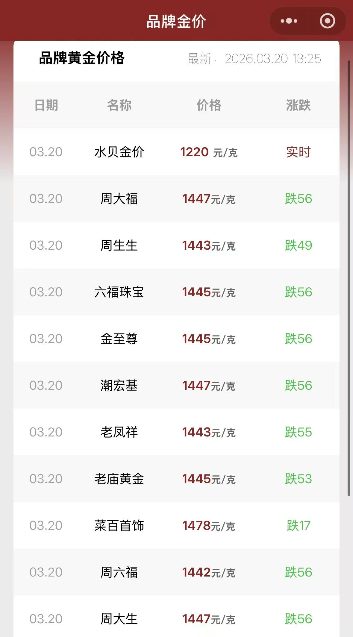 受夜盘国际金价跳水影响,3月20日,国内金饰价格重挫,多个品牌克价跌至1440元左右,两天跌去百元左右。其中,周大福(01929.HK)足金饰品报1447元/克,较前一日1503元/克跌56元,两天跌去98元;老庙黄金足金饰品报1445元/克,较前一日1498元/克跌53元,两天跌去105元;周生生(00116.HK)足金饰品报1443元/克,较前一日1492元/克跌49元,两天跌去104元;老凤祥(600612.SH)足金饰品报1443元/克,较前一日1498元/克跌55元,两天跌去97元。